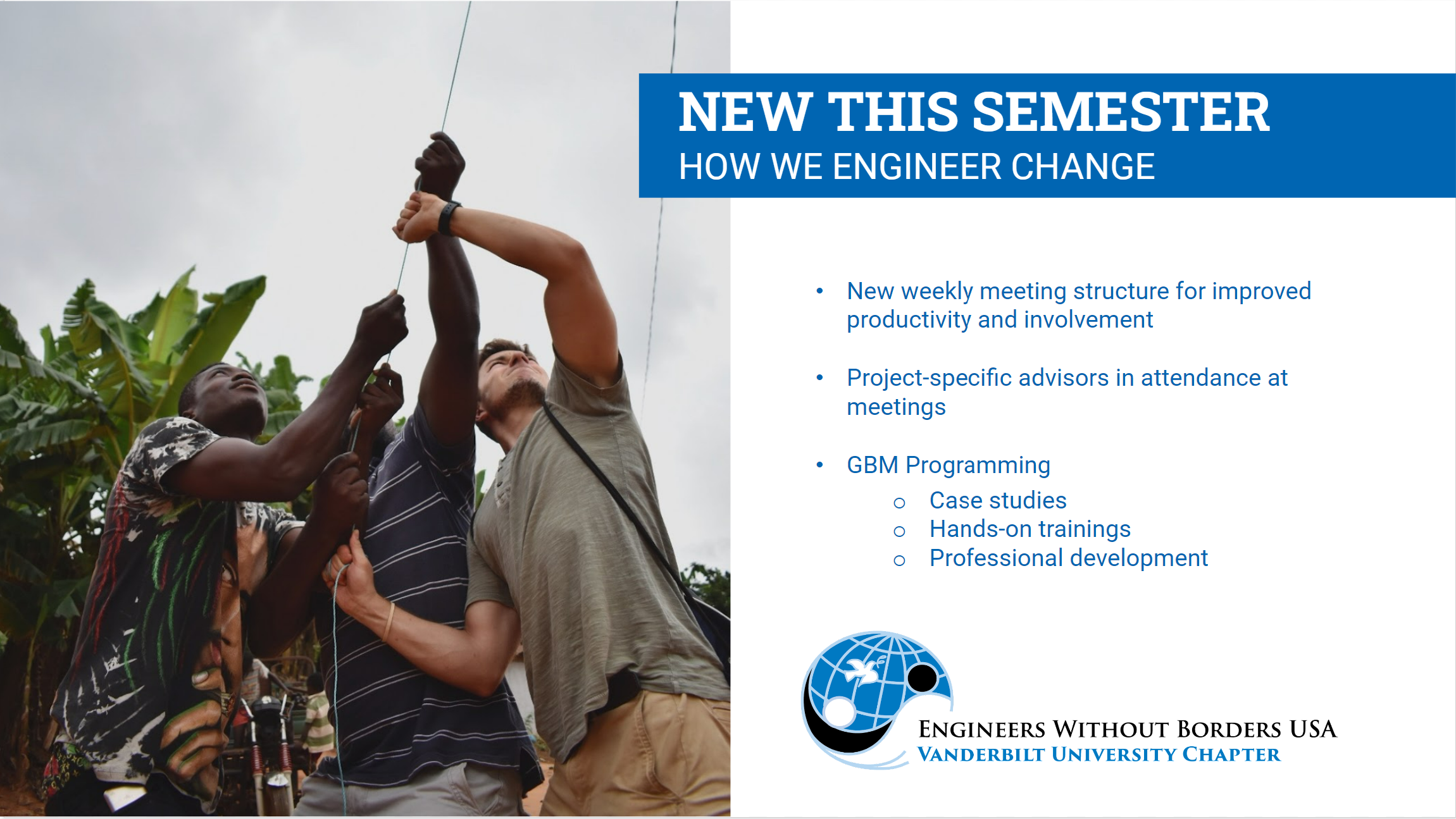 EWB-Vanderbilt is a chapter of EWB-USA, a non-profit humanitarian organization that aims to use sustainable engineering projects to empower developing communities around the world.